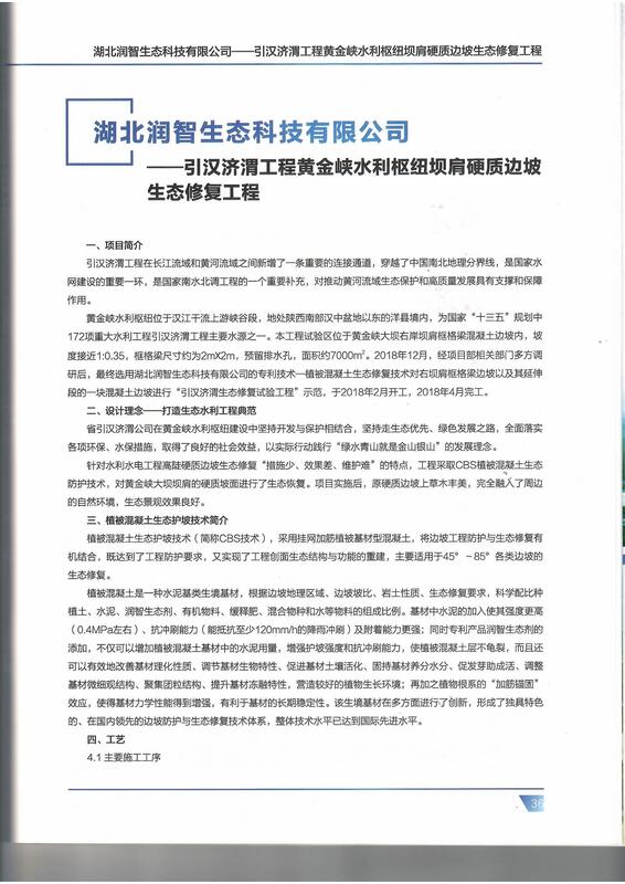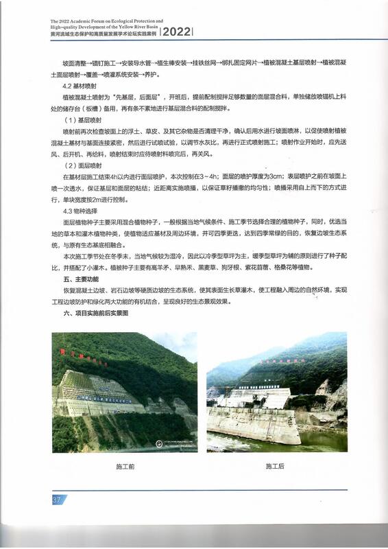 湖北潤智生態科技有限公司作為國內生態護坡領航者,其創新成果緊扣陜西省科學技術協會聯合沿黃省區科協等單位舉辦的“2022年黃河流域生態保護和高質量發展學術論壇”的主題,貫徹習近平總書記關于黃河流城生態保護和高質量發展的系列重要講話材神,落實黃河國家戰略,我公司相關創新成果CBS植被混凝土/VCS植生水泥土等生態防護技術、專利產品—潤智生態劑,及典型案例——“引漢濟渭工程黃金峽水利樞紐壩肩硬質邊坡生態工程”作為科技與經濟融合的成功案例獲得入選“2022黃河流域生態保護和高質量發展學術論壇實踐案例”中。